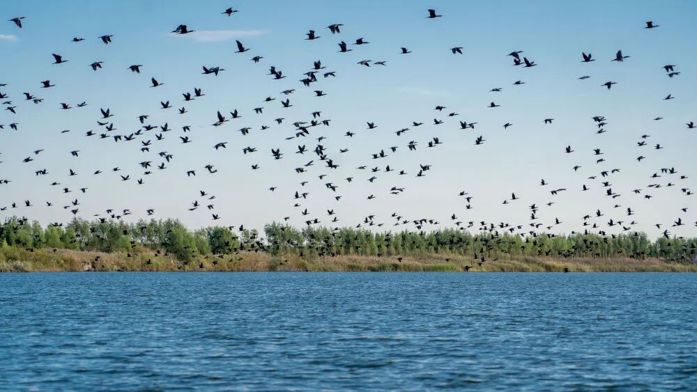 9月23日,吉林省大安市嫩江湾湿地保护保育区内,鸬鹚成群在江面翱翔。唐成卓 摄