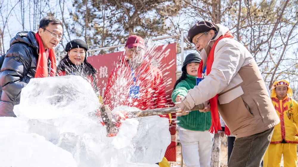 吉林省大安市白酒文化体验园内,游客正在劈冰块,体验非遗辽代古法酿酒工艺。(3月11日摄)唐成卓 摄