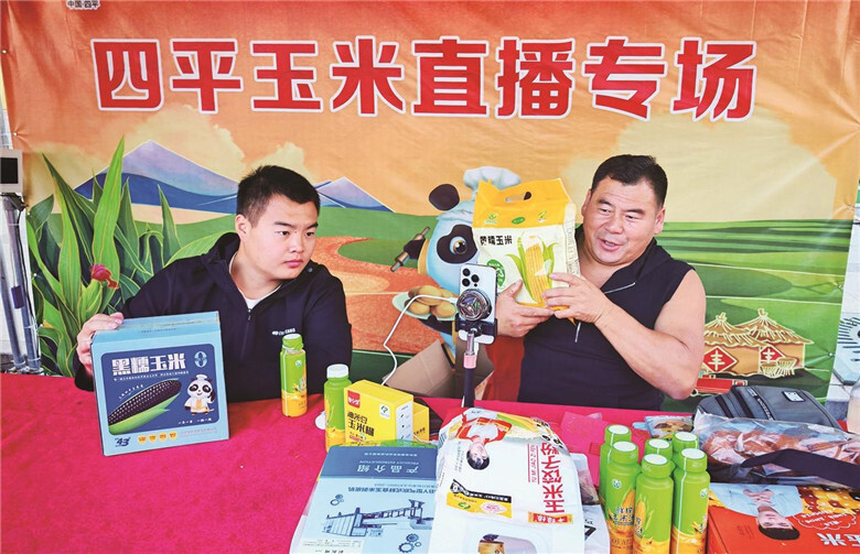 玉米电商直播展位推介四平优质农产品。 高鸿 摄