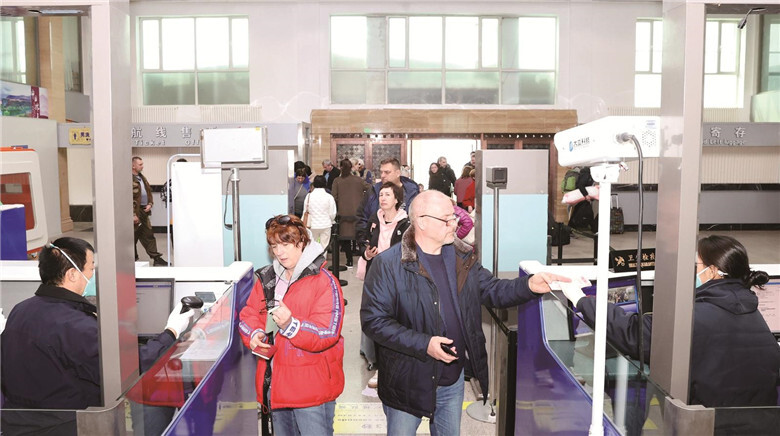 工作人员正在为游客办理过境手续。