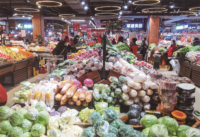 我省全力做好“菜篮子”产品保供稳价工作,保证粮油肉蛋奶果蔬等供应充足、价格稳定。图为市民在一大型连锁超市蔬菜水果区选购。