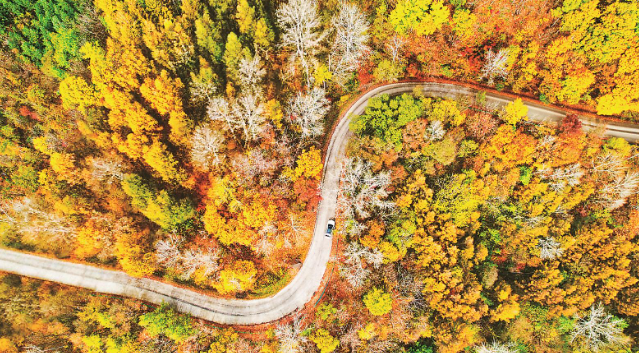 桦甸市红石镇会全栈村的山岭被风霜染得色彩斑斓,勾勒出一幅风情万种的秋日动人画卷。