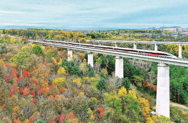 沈白高铁列车驶出长白山西站,穿越五花山林。