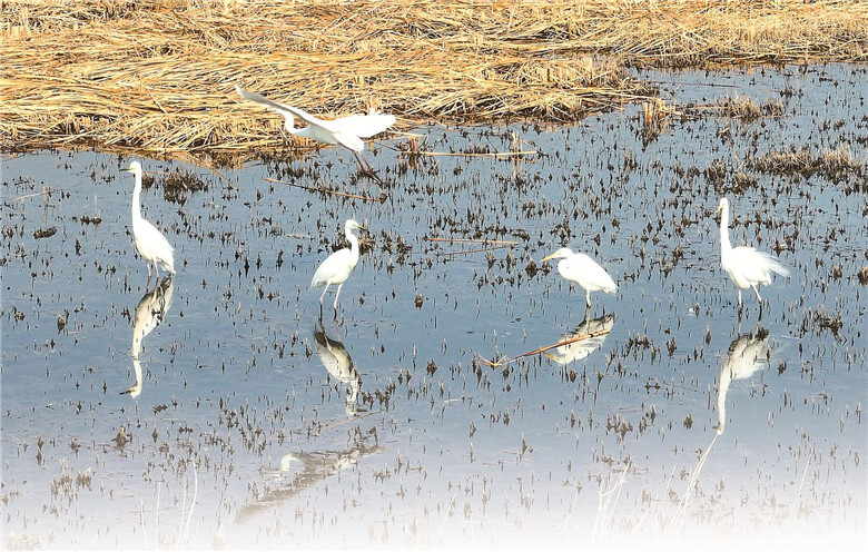 冰雪融化,大白鹭早早来到莫莫格湿地活动。