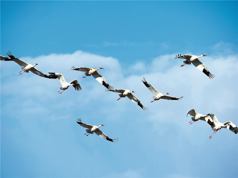 镜头下,洁白白鹤或浅滩踱步觅食,羽翼映着碧水蓝天,画面静谧雅致;或振翅凌空、列队翱翔,万鸟齐飞气势磅礴,动态景致极具视觉冲击力。白枕鹤、东方白鹳、小天鹅等珍禽,与各类雁鸭、鸥鸟和谐栖息,鸟鸣声声、生机盎然,定格出人与自然共生的绝美瞬间。