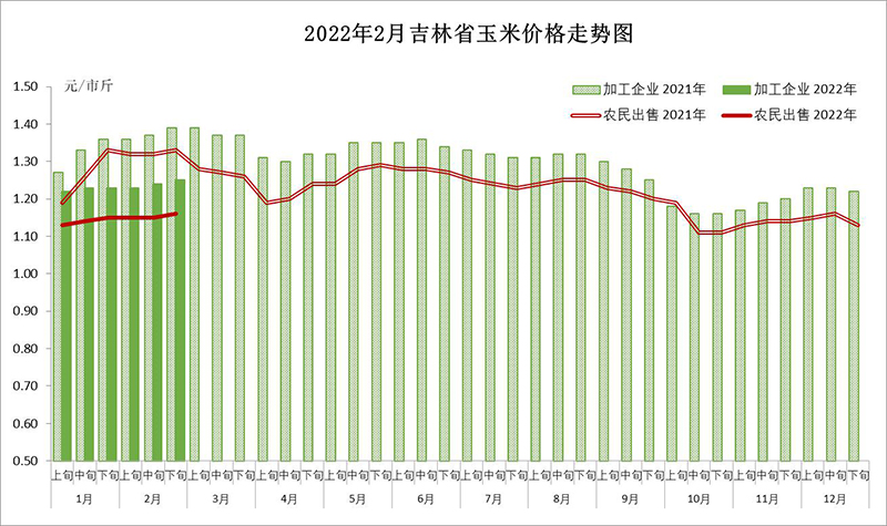 2月,节后我省农民售粮进度继续提升,市场启动较快,交易逐渐活跃,收购主体增多,玉米价格有所上涨。据12316热线平台不完全数据统计,2月省内农民出售标准水玉米月均价(元/市斤,下同)为1.16,环比上涨0.02、提高1.75%,同比下降0.16、降低12.12%。全省各地区农民坐家出售标准水玉米价格范围为:四平1.15-1.26,松原1.13-1.23,长春1.11-1.24,辽源1.11-1.23,通化1.10-1.23,白城1.09-1.22,吉林1.05-1.22,延边州1.01-1.22,白山1.01-1.13。