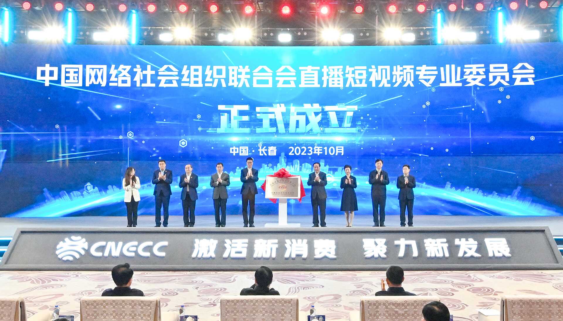 牛一兵和世界互联网大会秘书长、中国网络社会组织联合会会长任贤良共同为中网联直播短视频专业委员会揭牌。