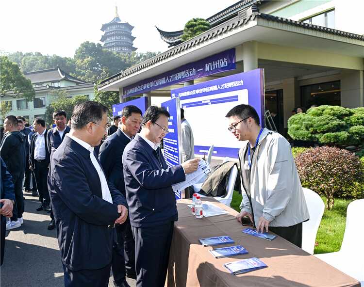 10月18日,省委书记景俊海,省委副书记、省长胡玉亭来到吉林省重点企事业单位高端人才招聘杭州站活动现场,详细了解招聘岗位、人才回归等情况。邹乃硕 摄