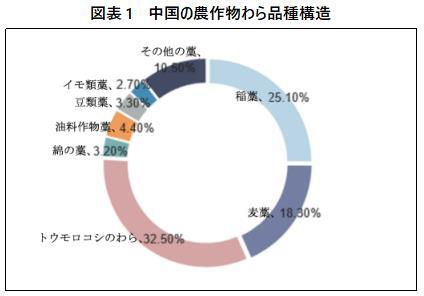 中国の毎年農作物のわらの理論資源量と収集可能資源量はいずれも世界第1位であり、世界のわらの総生産量に占める割合は比較的に大きい。その中で、水稲、小麦、トウモロコシなどの主要農作物から発生するわらの総量は比較的に大きい割合を占め、3つの合計は約80%前後に達した。これらのわら資源の生産量分布は地域差によって異なり、食糧生産量と直接対応関係がある。