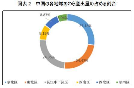 発生量から見ると、わらの発生量は華北区、東北区、長江中下流区、西南区、西北区、華南区であり、それぞれ全国わら総量の27.18%、24.47%、24.35%、9.19%、8.87%、5.94%を占める。