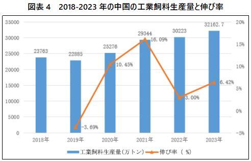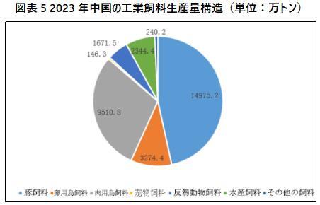 2023年、中国の産業用飼料の総生産量は32162.7万トンで、前年比6.42%増である。品種別に見ると、豚の飼料生産量は10.1%増の14975.2万トンと最も増加した。卵用鳥の飼料生産量は3274.4万トンで、2.0%増加した。食肉・家禽飼料の生産量は6.6%増の9510.8万トン、反すう動物飼料の生産量は1671.5万トンで、3.4%増加した。水産飼料の生産量は2344.4万トンで、4.9%減少した。ペット飼料の生産量は146.3万トンで、18.2%増加した。その他の飼料の生産量は240.2万トンで、7.6%増加した。