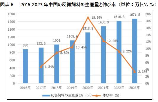 中国飼料工業協会のデータによると、2016年以来、中国の反芻工業飼料の生産量は段階的に増加し、2018年には1000万トンを突破した。2022年、中国の反芻動物飼料の生産量は1616.8万トンで、9.22%増加した。2023年、中国の反芻動物飼料の生産量は1671.5万トンで、3.38%増加した。しかし、中国の養殖構造の影響を受けて、反芻動物飼料の開発と生産は中国の飼料工業市場で比較的に小さく、近年比率は向上しているものの、全体の比率は5%程度にすぎない。そのため、将来の中国の牧畜業の発展に伴い、業界もより大きな発展空間を迎えると予想されている。
