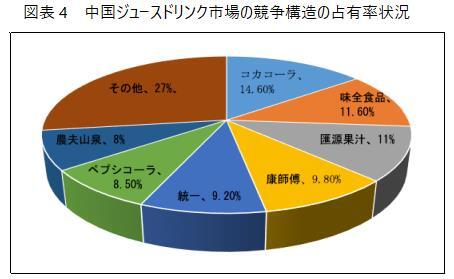 データによると、中国のジュースドリンク業界のトップ企業の市場占有率はいずれも10%を超え、業界中の市場占有率のトップ3企業はそれぞれコカ・コーラ(中国)、味全食品、匯源果汁で、占有率はそれぞれ14.6%、11.6%、11%である。また、康師傅、統一、ペプシコーラ「果繽紛」、農夫山泉も続いており、それぞれ9.8%、9.2%、8.5%、8.0%を占めている。