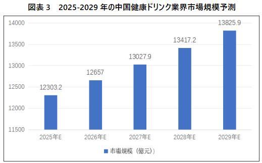 高品質で高付加価値な健康ドリンクに対する消費者の需要が増加し、市場規模の拡大を推し進める。加えて、健康ドリンク業界は絶えず新製品を発売し、消費者の味、機能、包装などの多様なニーズを満たしている。製品の革新と多様化はより多くの消費者を引き寄せ、市場規模の成長をさらに推進するだろう。ニールセンIQ関連データによると、2025-2029年、中国健康ドリンク業界の市場規模は2.9%の年複合伸び率で増加する見込みで、2025年末までに、中国健康ドリンク業界の市場規模は12303.2億元に増加する見込みで、2029年末までに、中国健康ドリンク業界の市場規模は13825.9億元に増加する見込みである。
