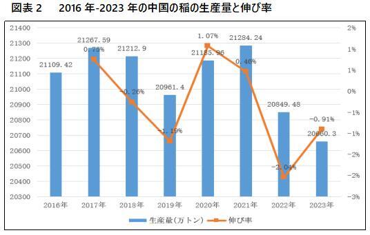 水稲生産量の変化傾向は栽培面積と同時に変動し、近年平年2億トン以上を維持しており、単産レベルの向上のおかげで、近年全国の水稲栽培面積は低下しているが、水稲生産量全体は依然として増加傾向を維持している。2022-2023年の間、中国の水稲生産量は2年連続で年々減少傾向を示したが、前年同期比のダウン幅は栽培面積のダウン幅よりやや小さかった。