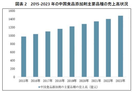 近年、経済発展と消費レベルの向上に伴い、消費者の食品の品質、食感、栄養などに対する要求は絶えず高まっている。これにより、食品生産企業は食品添加物をより多く使用して製品の市場競争力を向上させ、食品添加物業界の売上高アップを推進した。統計によると、2023年の中国食品添加剤主要品種の売上高は約1477億元で、前年同期比5.35%アップした。