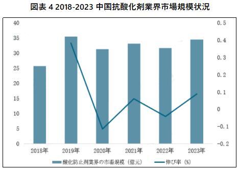 酸化防止剤は、酸素の悪影響を防ぐ特殊な化学物質として、食品、医薬、化粧品など多くの分野で広く応用されている。特に食品工業において、酸化防止剤はその独特な食品酸化防止または遅延機能で、食品の賞味期限と安定性を大幅に向上させ、不可欠な食品添加剤となった。近年、中国における酸化防止剤業界の市場規模は一定の変動を示している。2022年は国内外の経済情勢の変化、業界競争の激化、消費者需要の変化などの要因の影響を受け、前年同期比4.38%減の31.65億元となった。しかし、2023年には国内外の市場需要が回復し、酸化防止剤の市場規模はまた徐々に上昇し、前年同期比8.69%増の34.4億元に達した。