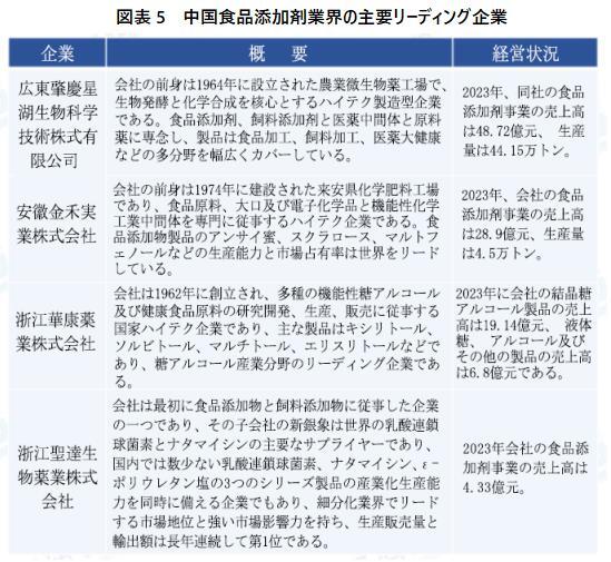 中国で現在使用が許可されている食品添加剤は2400種類以上あり、各種食品添加剤は原料、技術、プロセスなどの面で千差万別である。各食品添加剤の市場規模は比較的に小さく、業界内で競争している企業の多くは小型企業であり、各企業は、プロセスが似ているか、用途が似ている1種類または数種類の製品の生産に足を踏み入れており、産業全体の集中度は低い。1種類の製品について言えば、通常市場規模が小さく、産業の集中度が高いため、中国の食品添加剤業界は全体的に分散しており、中小企業が多く、一部の細分品種、細分業界の集中度が高い市場構造を呈している。