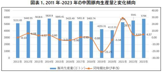 2020年の豚高価格による高利益の激励の下で、2021年、中国における生豚養殖業は急速に拡大し、養殖規模は大幅に増加し、豚肉の生産量は明らかに上昇し、豚肉の価格は大幅に下落し、一部の生豚養殖企業は赤字になったり倒産したりした。2022年、国内の豚生産能力は引き続き解放され、豚肉生産量は増加傾向を維持したが、去年の業界の大幅な赤字を背景に、2022年の全国の豚肉生産量の増加幅は明らかにスピードダウンした。国家統計局の統計データによると、2023年の全国豚肉生産量は5794万トンで、前年同期比4.57%増え、近年のピーク生産量(2014年、5820.8万トン)の回復まで26.8万トンの差がある。