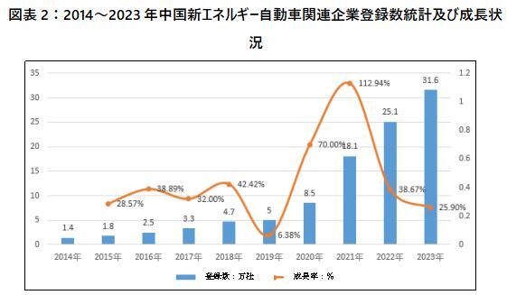 ここ10年来、中国の新エネルギー自動車関連企業の登録数は年々増加しており、特に2021年に、年間登録数が前年同期比112.3%急増し、18.1万社に達し、ここ十年の上げ幅のピークとなった。そのうえ、2022年に中国の新エネルギー自動車関連企業の登録数が前年同期比38.3%増加し、25.1万社に達し、2023年は年間登録数が初めて30万社を突破し、前年同期比26.1%増で31.6万社に達し、ここ十年来の新記録を樹立した。