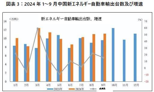 中国自動車工業協会のデータによると、2024年9月中国の自動車輸出台数は53.9万台で、前月同期比5.4%増、前年同期比21.4%増となった。新エネルギー自動車の輸出台数は11.1万台で、前年同期比15.6%増、前月比0.9%増となった;1月~9月、自動車の累計生産台数は2168.3万台で、前年同期比2.7%増、累計輸出台数は431.2万台で、前年同期比27.3%増となった;新エネルギー自動車の累計生産台数は831.6万台、累計輸出台数は92.8万台で、前年同期比12.5%増で、自動車輸出総台数の21.5%を占めている。