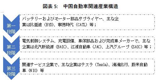 現在、中国の新エネルギー自動車関連産業は初歩的に形成されており、主に三段階に分かれている。第一段階はバッテリーおよびモーター部品サプライヤーで、主な企業は比亜迪(BYD)、寧徳時代(CATL)などが挙げられる;第二段階は電気制御システム、充電設備、車体部品および完成車メーカーで、主な企業は北汽新能源(BAIC)、江淮自動車(JAC)、上汽グループ(SAIC)などが挙げられる。第三段階は関連サービス企業で、主な企業にはテスラ(Tesla)、滴滴出行、蔚来自動車(NIO)などがある。