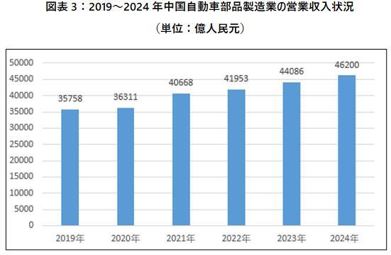 中国国内の自動車部品の製造レベル向上や電気自動車の発展につれて、自動車部品業界も急速な成長を遂げている。2022年、自動車部品製造業の営業収入は約41953億元で、前年同期比3.16%増加した。2023年は約44086億元である。2024年に自動車部品製造業の営業収入はさらに46200億元までに増加した。