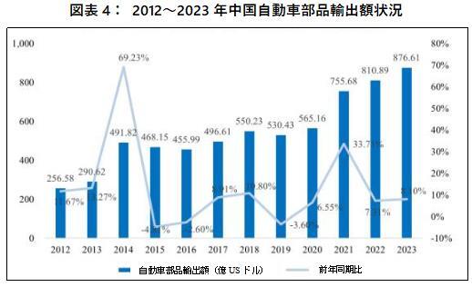 2022年と2023年、中国の自動車部品輸出額は引き続き安定した成長を維持した、前年同期比でそれぞれ7.31%と8.10%増加し、810.89億元と876.61億元に達した。今後、中国の自動車部品メーカーの品質管理システム、グローバルな供給能力、国際製品認証などにおいて進歩していくにつれ、中国の自動車部品メーカーの国際市場における競争力も強化され、輸出市場では引き続き良好な成長の見通しがある。