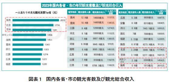 2023年には全国各省・市の観光接待客数と観光収入が大幅にアップし、海南、北京、吉林の1人当たりの消費が注目された。北京・上海・広州・シンセンの一線都市に比べ、貴州、雲南の観光市場の潜在力は大きい。