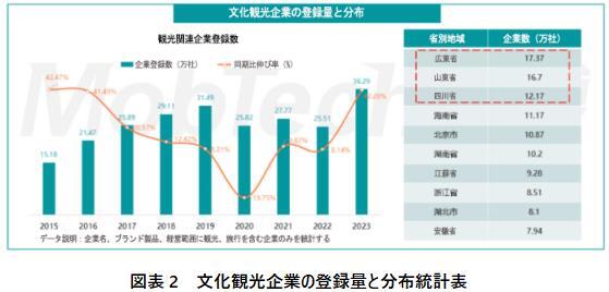 疫病終了後、文化観光の消費は急速に回復し、2023年の観光関連企業の登録数は36.29万社で、前年同時期比42.28%増である。各省別に見ると、広東、山東、四川の現存する観光関連企業の数はTop3にある。