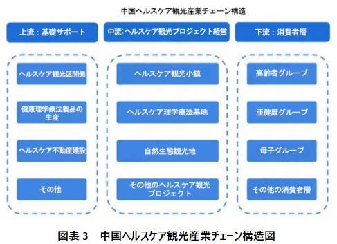 産業チェーンの角度から、ヘルスケア観光産業チェーンは上流の不動産開発投資、計画建設、中流のヘルスケア旅行プロジェクト運営者、下流のプロジェクト普及ルート業者を含む。ヘルスケア観光プロジェクトのライフサイクルは、「開発-計画設計-建設-運営」のチェーンに沿って発展・延びている