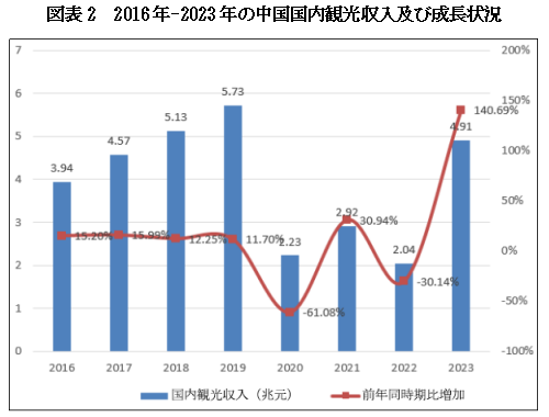 2023年、国内観光収入(旅行総費用)は4.91兆元で、前年比2.87兆元増で、前年比140.69%増、成長幅は顕著で、2020年以来の低迷局面を逆転した。同時に、2023年の国内観光収入は疫病前の2019年と比べて2019年同時期の85.69%に回復し、格差は明らかに縮小し、国内観光消費の活力と潜在力を示した。2023年、中国の国内観光客の旅行総費用のうち、都市部住民の旅行総費用は41781億元で、147.5%増加した。農村住民の旅行費は7353億元で、106.4%増加した。インバウンド観光客は総530億ドルを費やした。