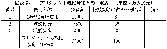 プロジェクト総投資額は20000万元、そのうち、観光地の買収費用12000万元、建設投資額7600万元、流動資金400万元である。