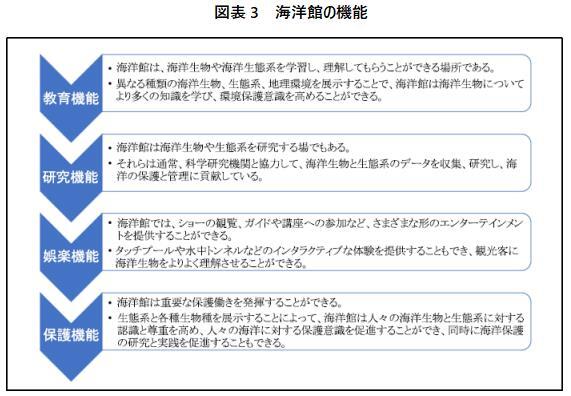 海洋館には教育機能、研究機能、娯楽機能、保護機能などの働きがある。