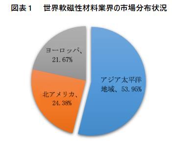 軟磁性材料は電力電子、通信電子、コンピュータ、太陽光発電インバータ、新エネルギー自動車などの分野に広く応用されている。これらの業界の発展に伴い、世界の軟磁性材料業界の市場規模も絶えず拡大している。市場分布の状況を見ると、世界の軟磁性材料業界の市場占有率が最も高いのはアジア太平洋地域で、占有率は53.95%、次に北米地域で、市場占有率は24.38%、3位は欧州で21.67%である。