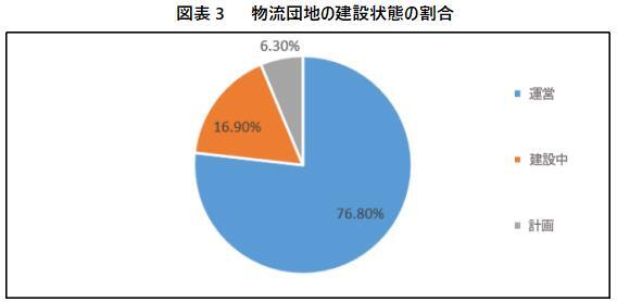 今回の調査に入った2769団地のうち、運営状態(団地で物流業務を展開中)にあるのは76.8%の2127社で、2022年の調査の74.6%から2.2ポイント上昇した。建設中(団地の建設中で未開業)のは468社で、16.9%を占め、2022年調査の15.5%から1.4ポイント上昇した。計画状態(団地ではフィージビリティスタディが行われているがまだ建設が始まっていない)にあるのは174社で、6.3%を占め、2022年調査の9.9%から3.6ポイントダウンした。