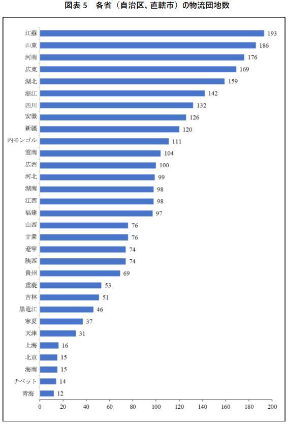 物流団地の総数上位3省はそれぞれ江蘇、山東、河南である。全国には12の省の物流団地が100ヶ所以上ある。