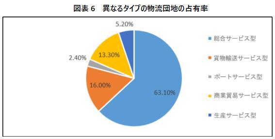 団地が依存する物流資源と市場需要の特徴に従い、サービス対象と機能に基づき、団地を貨物輸送サービス型、生産サービス型、商業貿易サービス型、港サービス型と総合サービス型の5種類に分けた。調査の結果、総合サービス型団地が63.1%で最も高く、次いで貨物サービス型団地が16.0%を占め、商業貿易サービス型団地が13.3%を占め、生産サービス型と港サービス型物流団地が少なく、5.2%と2.4%を占めている。