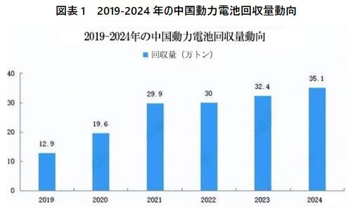 動力電池の集中的な退役に伴い、中国の動力電池回収業界は発展期に入り始めた。中商産業研究院が発表した「2024-2028年中国動力電池回収産業の発展傾向と投資リスク研究報告」によると、2019年から2022年にかけて、中国動力電池の実際の回収量は12.9万トンから30万トンに上昇し、2023年には32.4万トンに達した。2024年の動力電池の実際の回収量は35万トンを超える。