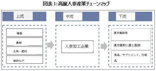 高麗人参業界産業チェーンの上流は主に人参栽培業である。原材料には種苗、土地、肥料、農業機械、施設などがある。産業チェーン中流は高麗人参加工企業であり、主に高麗人参の荒加工企業と高付加価値加工企業を含む。産業チェーン下流は主に漢方薬企業、高麗人参製品消費者という両方である。