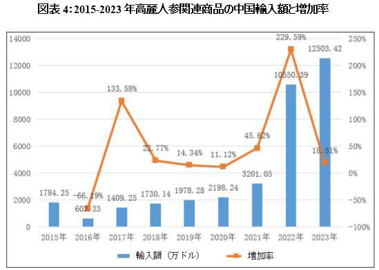 中国税関のデータによると、2017年以来、高麗人参関連商品の中国総輸入量は変動しながら増加傾向を示し、輸入額は年々増加している。2022年、高麗人参関連商品の中国輸入量は前年同期比3619.67トン増(49倍増)の3693.1トンに達し、輸入額は前年同期比7349万ドル増(2倍増)の10550.39万ドルに達した。 輸入量と輸入額の増分はいずれも「新鮮または乾燥西洋人参」の牽引によるものである。2023年、高麗人参の中国輸入量は5753.17トン(純輸入量3582.63トン)で、輸入額は貿易量とともに12503.42万ドルに増加した。