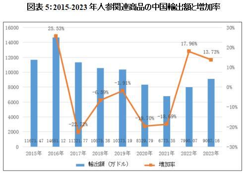 中国税関のデータによると、2017-2022年、高麗人参関連商品の中国総輸出量と総輸出額は全体的に変動しながら減少する傾向にあった。2022年、高麗人参関連商品の中国総輸出量は前年同期比286.36トン増(18.87%増)の1803.39トンに達し、総輸出額は前年同期比1216.72万ドル増(17.96%増)の7990.07万ドルに達した。2023年、高麗人参の中国輸出量は2170.54トンに増加し、輸出額は貿易量とともに9087.16万ドルに増加した。