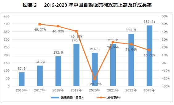 無人小売のビジネスモデルにおいて、自動販売機は市場全体において重要な役割を担っている。「24時間営業のミニスーパー」として、自動販売機は設置面積が小さく、人件費が不要で、時間と場所の制約がない。運営者にとっては、自動販売機は設置が容易で運営コストが低く、消費者にとっては、自動販売機は広範囲に設置されており、買い物が便利である。データによると、中国の自動販売機市場の総売上高は、2016年の87.9億元から2023年の389.21億元に増加し、年間複合成長率は26.01%である。