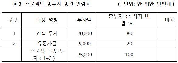 프로젝트 총투자는 2억 5천만 위안이고, 그중 건설 투자가 2억 위안, 유동자금이 5천만 위안이다.