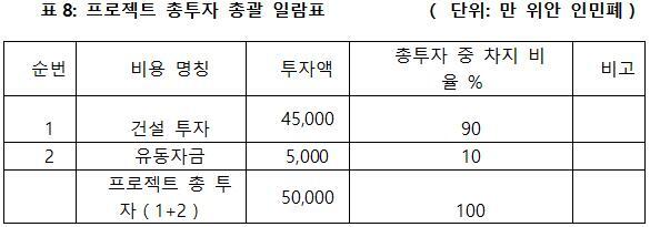 프로젝트 총투자는 5억 위안이고, 그중 건설 투자가 4억5천만 위안, 유동자금이 5천만 위안이다.