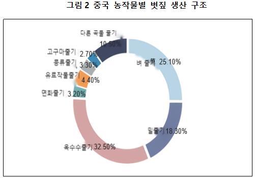 볏짚은 중국에서 생산되는 곡물 작물의 가장 큰 부산물이다. 볏짚은 성숙한 농작물의 줄기와 잎(이삭 포함)을 통칭하며, 일반적으로 밀, 벼, 옥수수, 감자류, 유채, 목화, 사탕수수 및 기타 잡곡 작물의 수확 후 남은 부분을 의미한다. 중국에서 옥수수, 벼, 밀, 유채, 대두, 목화 등 주요 농작물에서 발생하는 볏짚의 총량은 8억 6,500만 톤에 달하며, 이 중 수거 및 활용 가능한 볏짚의 양은 7억 3,100만 톤에 이른다.