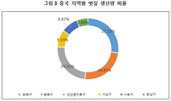 볏짚 생산량을 지역별로 살펴보면, 생산량이 많은 지역 순으로 화북 지역, 동북 지역, 창장(长江) 중하류 지역, 서남 지역, 서북 지역, 화남 지역으로 구분되며 각각 27.18%、24.47%、24.35%、9.19%、8.87%、5.95%이다.