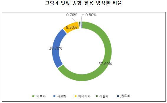 최근 몇 년 동안, 농업·농촌 부문에서는 볏짚 종합 활용 사업을 적극적으로 추진하고 있으며, 농업 활용을 우선으로 하면서 다양한 방안을 병행하고, 산업 발전을 유도하는 전략을 지속적으로 실행하고 있다. 이를 통해 볏짚 종합 활용의 효율성을 꾸준히 향상시키고, 지역별 특성에 맞는 활용 모델을 구축하고 있다. 현재 볏짚 종합 활용률은 88.1%에 달하며, 비료화, 사료화, 에너지화, 기질화, 원료화가 각각 57.6%、20.7%、8.3%、0.7%와 0.8%에 달한다.