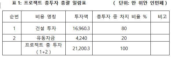 프로젝트 총투자는 2억1,200만 3천 위안이고, 그중 건설 투자가 1억6,960만 3천 위안, 운영 자금이4,240만 위안이다.