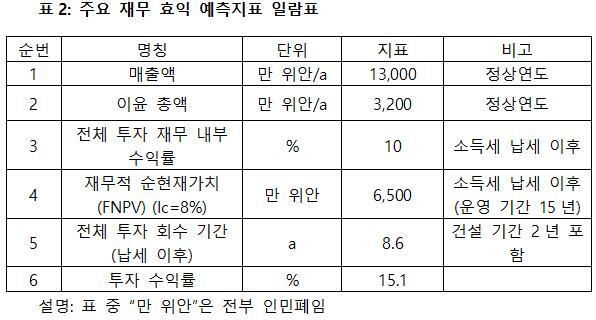 프로젝트가 설계 생산 능력의 생산량에 도달한 후 연간 매출액 1억3,000만 위안, 연간 순이익은 3,200만 위안, 투자회수기 8.6년(납세 이후, 건설 기간 2년 포함), 투자 수익률은 15.1%이다.